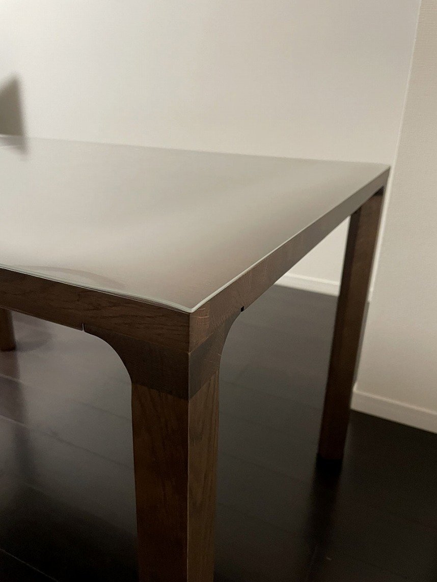 この度はテーブルマット匠をご購入いただきまして誠にありがとうございます。繊細なダークブラウンの木目が味わい深いテーブルですね!テーブルマット匠が合わさったことで天板に波一つない湖面のような美しさが感じられます。サイズ感もぴったりとのことで、ご満足いただけたこと大変嬉しく存じます。テーブルマット匠はテーブルの天板を傷や汚れから守るだけでなく、素材感を生かしつつ高級感を引き上げる効果もございます。また、テーブルとテーブルマットの間に気泡が入らない加工を施しておりますので、べたつかず通気性が良いものとなっております。そのため、ウォールナット材やオーク材のような無垢材のテーブルにもご使用いただけます。今回ご依頼いただきましたテーブルは新しく買い替えられたものとのことで、テーブルマット匠と合わせてこれからも長くご愛用いただければ幸いです。