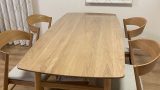 表面がベタベタすることなく、マットもしっかりしていて透明感も良いと思います。テーブルの塗装にこだわりましたので、透明感で選びました。面取り加工は見た目ほとんどわかりませんが、肘を置くと角が当たらないので、追加加工頼んで正解でした。届いて、開けた瞬間、表と裏がわからなかったのですが匠シールが貼ってあり、助かりました。サイズは完璧でした。