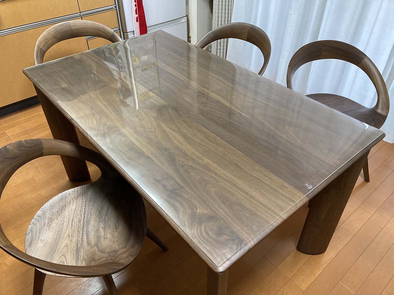 今回は厚さ3mmで製作しましたが、テーブルマット匠は透明度が高いので天然木の木目の美しさを損なうことがありません。むしろ今回の画像のようにさらに高級感が増しているかと思います。テーブルマット匠はサイズも角丸もミリ単位でオーダーできるのでどのようなテーブルでもぴったりに製作できます。さらに今回はマットの淵の直角を削り落とす『面取り加工』を施しましたので手触りも良くテーブルとの一体感をさらに増すことができたかと思います。裏面にはシボ加工(細かい凹凸)施しているので他のビニールマットのようにテーブルにベタっと張り付いて嫌な気泡ができるとういうことがありません。マットを外す際にも塗装が張り付いてしまうことがありません。両面にポリウレタンUVコーティングを施しておりますので日焼け、キズや汚れにも強くインクの転写もいたしません。ベタつかず、食器が動かしやすいさらりとした手触りも好評です。耐熱は60度位ですので高温のものを置く時だけはご注意くださいませ。除光液、薬品、クリーナー(研磨剤入りは使用しないでください)にも強いのでお手入れもしやすい商品になっております。いつまでもそのままの状態でお使いいただけるかと存じます。