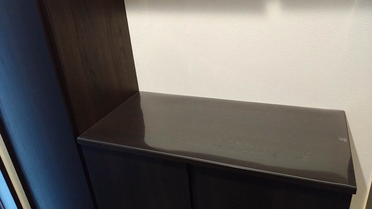 重厚なカラーの天然木の靴箱、日常使いの中で傷つかないよう美しさを保つのは難しい側面もございます。このようなお悩みの解決にテーブルマット匠は最適です。今回は厚さ2mmで製作しましたが、テーブルマット匠は透明度が高いので天然木の木目の美しさを損なうことがありません。むしろ今回の画像のようにさらに高級感が増しているかと思います。テーブルマット匠はサイズも角丸もミリ単位でオーダーできるのでどのようなテーブルでもぴったりに製作できます。裏面にはシボ加工(細かい凹凸)施しているので他のビニールマットのようにテーブルにベタっと張り付いて嫌な気泡ができるとういうことがありません。マットを外す際にも塗装が張り付いてしまうことがありません。両面にポリウレタンUVコーティングを施しておりますので日焼け、キズや汚れにも強くインクの転写もいたしません。除光液、薬品、クリーナー(研磨剤入りは使用しないでください)にも強いのでお手入れもしやすい商品になっております。いつまでもそのままの状態でお使いいただけるかと存じます。