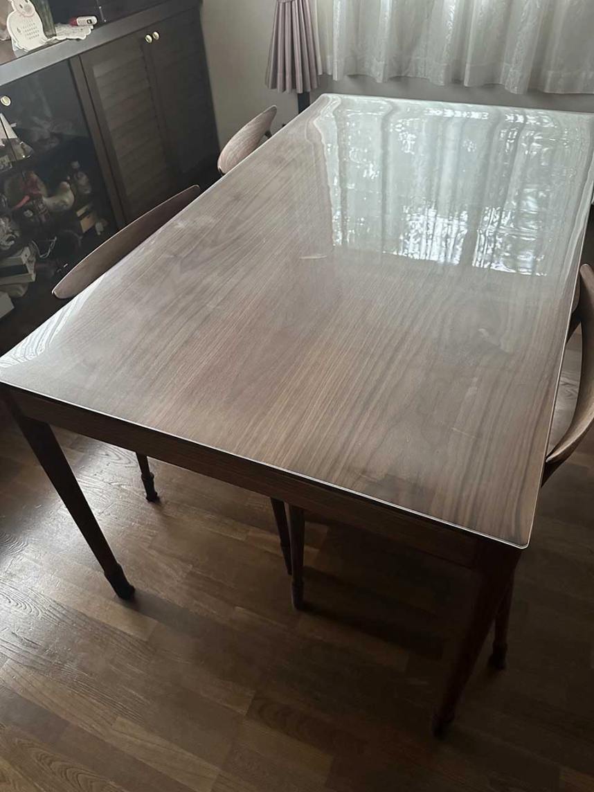 面取り加工、満足。角のRはテーブルの方がもっと角度ある丸みでしたが不自然な感じはありません。3㎜の厚みの透明度がどうかと思いましたが、事前にサンプルで確認した通りテーブルの質感を損ねない高級感があります。