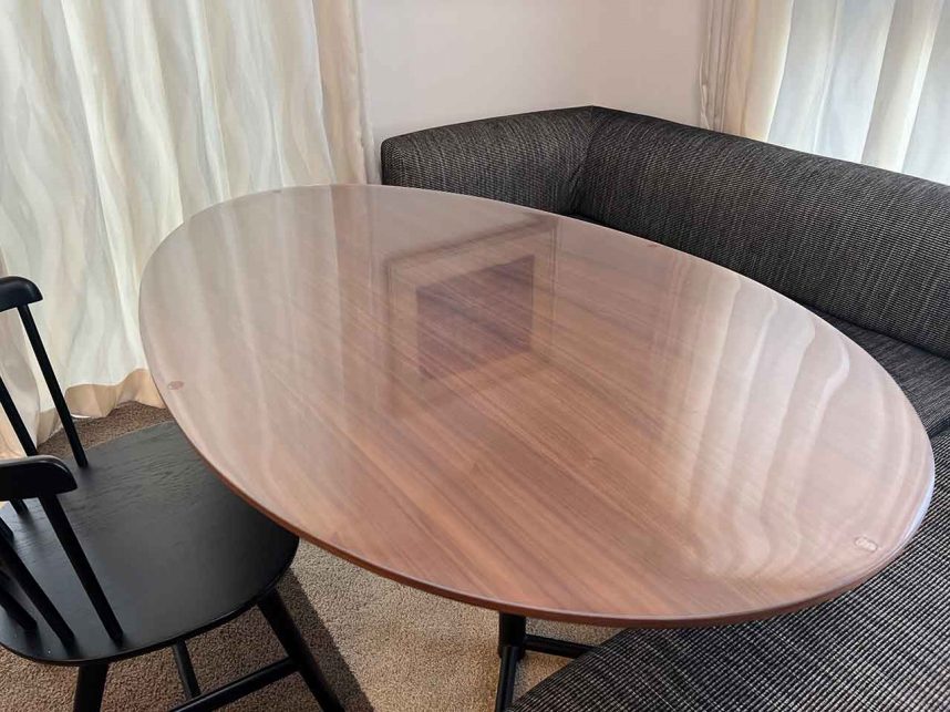 ダイニングテーブルの天板がドロップ型なので型取りしてうまくマットが作れるか心配してましたが出来上がりを引いてみたらピッタリ!完成品が到着してしばらくは丸みがあり少し浮いた感じでしたが1週間もすれば平らになりとても満足です。