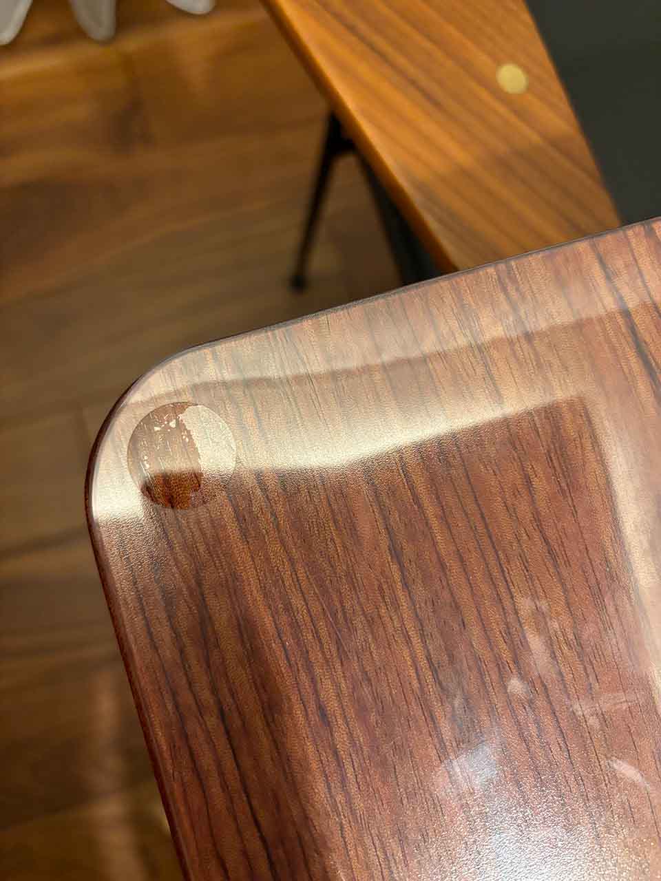 よくある透明マットのテカテカ感もなく自然で馴染んでくれています。義父が作ってくれたダイニングテーブルで四隅が規格サイズではないのですが、型紙注文ができたのでサイズもピッタリで大変満足しております。また、細かいですが同封していただいた滑り止めシールが目立たない点もありがたいです。