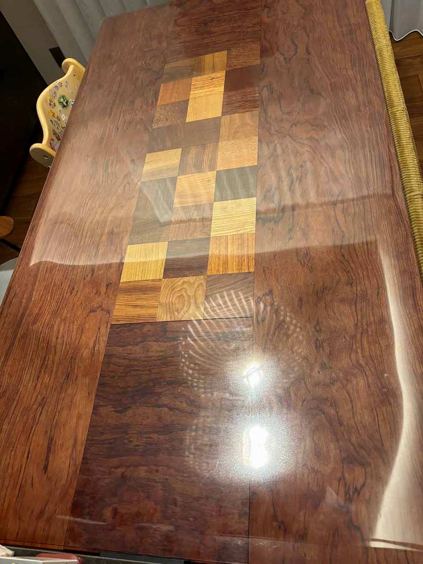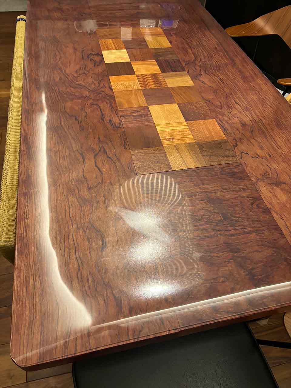 よくある透明マットのテカテカ感もなく自然で馴染んでくれています。義父が作ってくれたダイニングテーブルで四隅が規格サイズではないのですが、型紙注文ができたのでサイズもピッタリで大変満足しております。また、細かいですが同封していただいた滑り止めシールが目立たない点もありがたいです。
