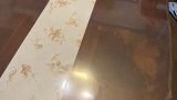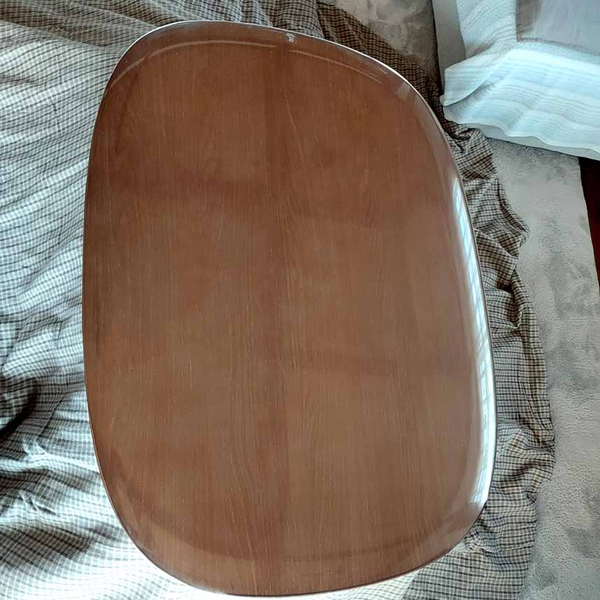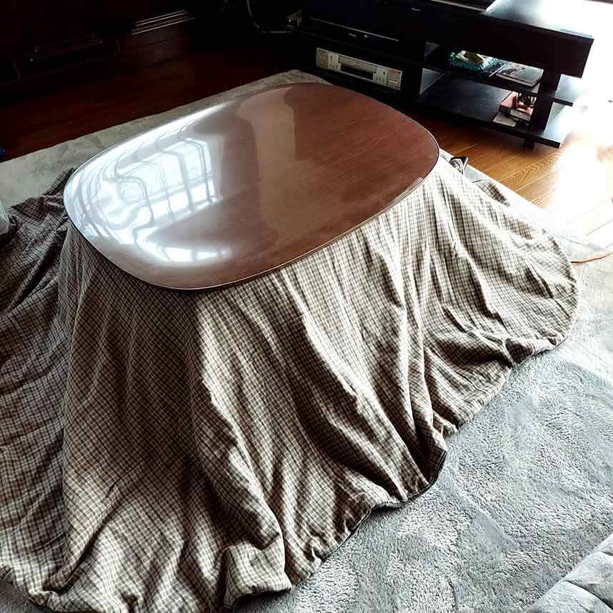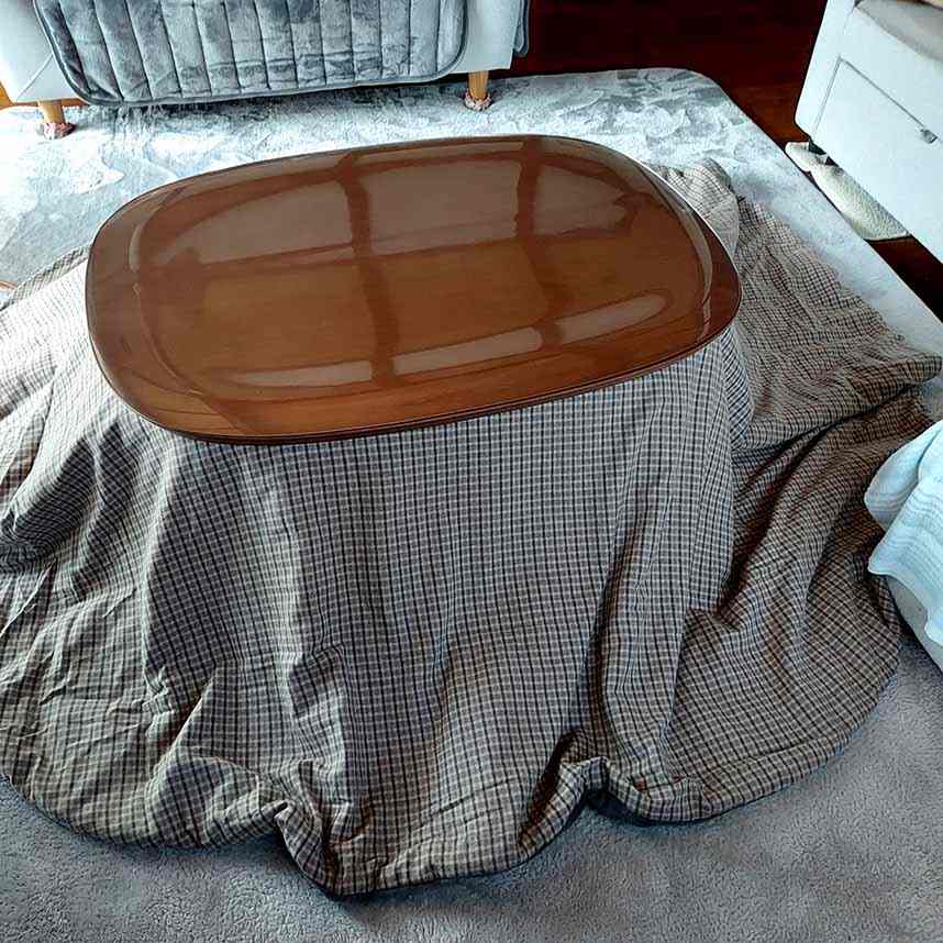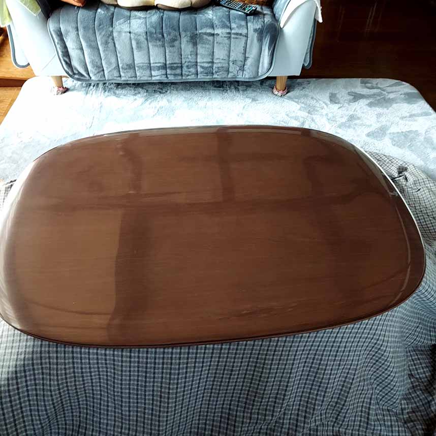 正方形のこたつから初めて楕円形の天板のこたつにしました。透明感が高く角が丸いのでとてもおしゃれな感じです。夏もこたつ布団を外して一年中使いたいので、使用頻度の高い天板もテーブルマットで清潔、綺麗が続きます。