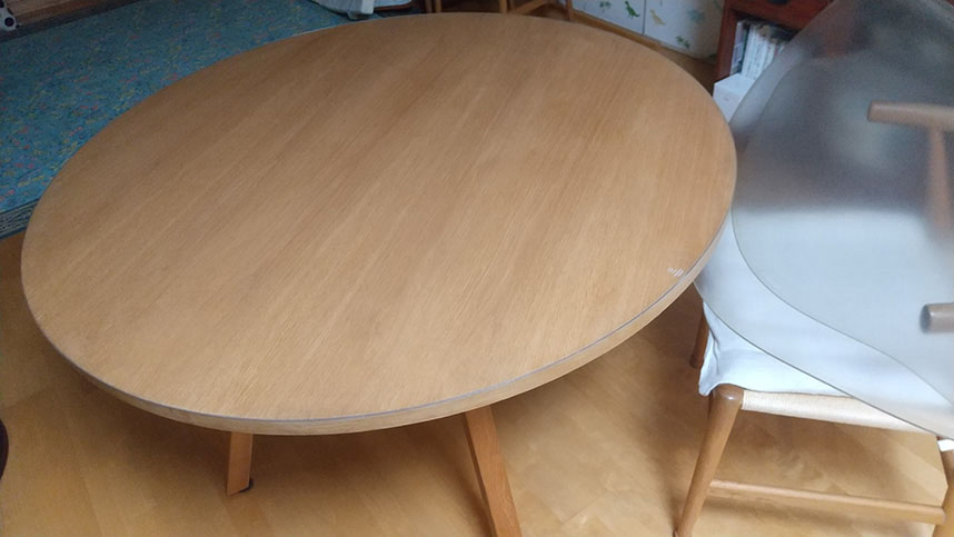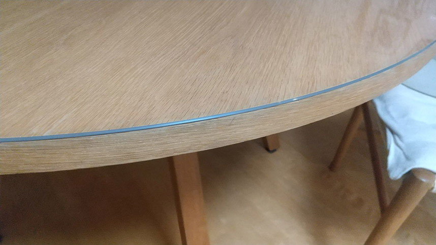 今までTインテリアでオーダーした同じ仕様(2mm厚 直径1200mm 面取りあり)の物を使っていました。9年過ぎて細かいキズ・ひび割れ・シミが目立ってきたので、今回取り替えることにしました。透明感・裏面の加工など前の物と同等で満足しています。