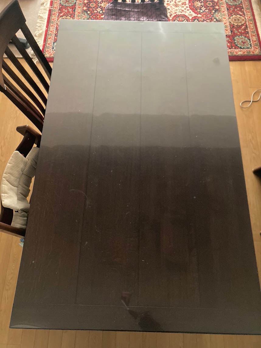 サイズやRや面取など、細かく指定できたのでピッタリでした!購入前は波打つシートを使用していたのですが、購入により完全に平坦になり、物を置く時のストレスがなくなりました。また、食器を置く時は、コースターなどを使い、親子共で丁寧に扱えるようになったかな、と思っています。なんとなく完全に透明ではないのですが、テーブルの木目は綺麗に見えていて、かなり満足できています。