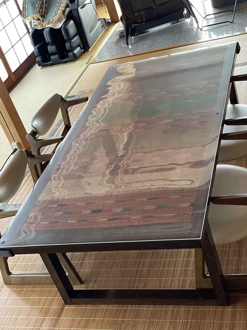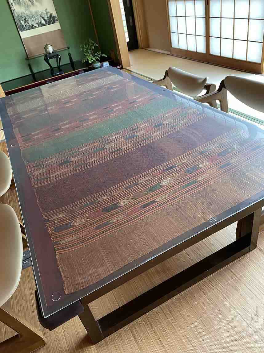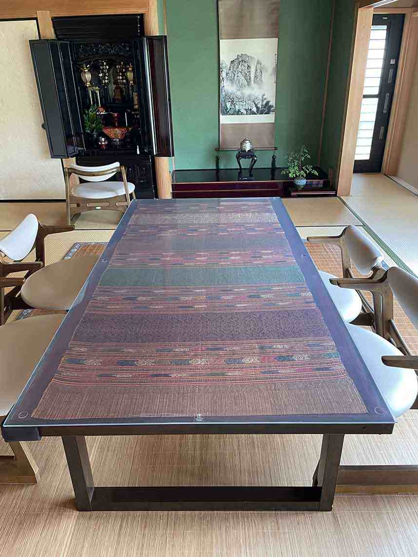 ダイニングテーブルの上にタイシルクを挟んで使用