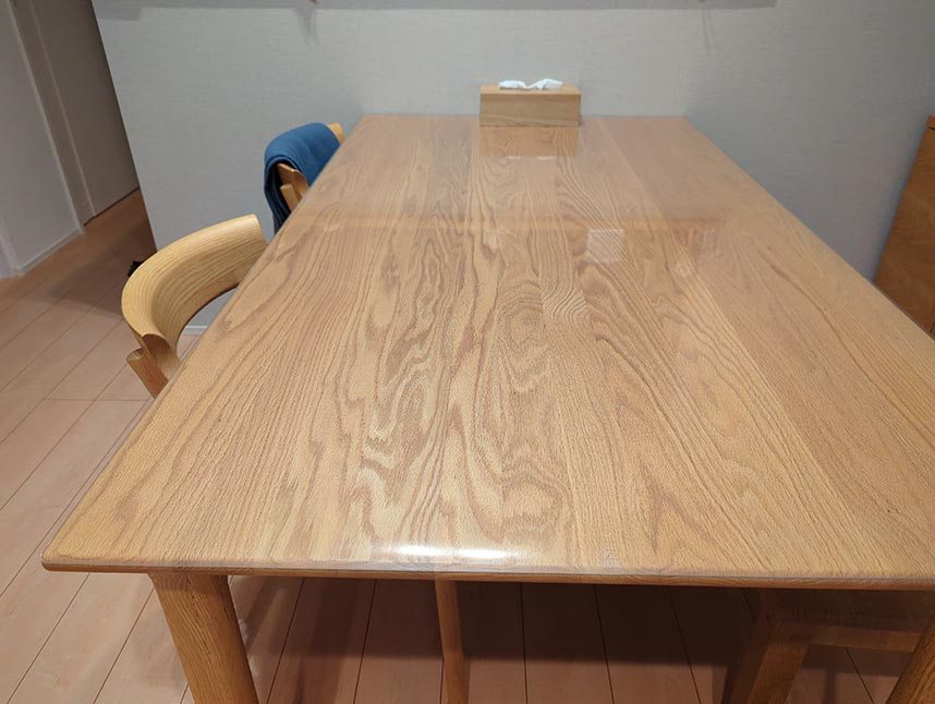 90×160センチのダイニングテーブル。サイズ通りでオーダーして、角はR10で指定でぴったりでした。