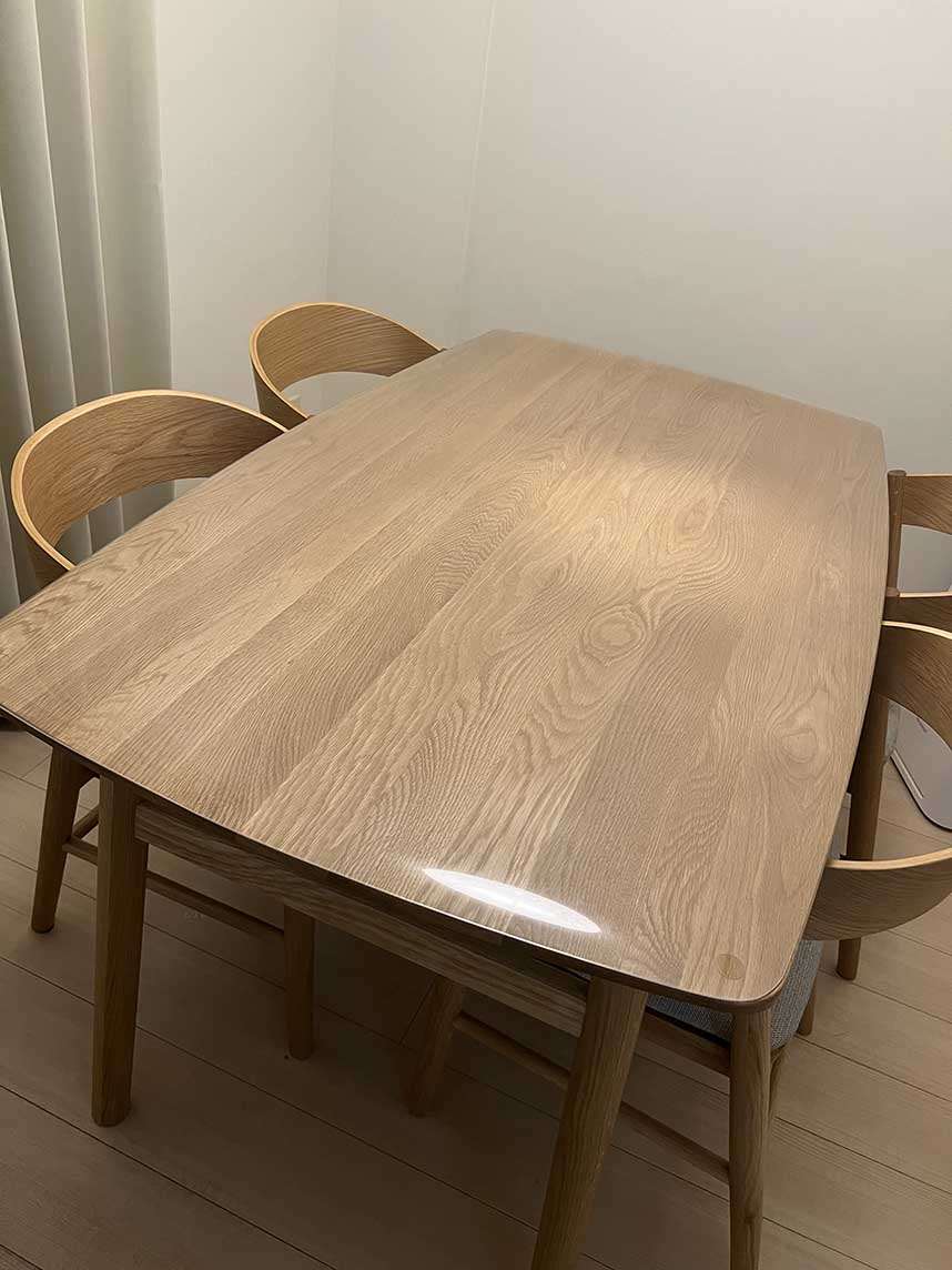 最高です!オイル仕上げのダイニングテーブルを使用しており、水滴のシミが付きやすいのが気になっていましたが、このテーブルマットのお陰で解決しました。商品は、事前にご相談させていただき2mmの面取り加工を選びました。マットの透明度が高く、一見ガラスのようにも見えます。木目もはっきり見えますし、安っぽくない所もお気に入りです。