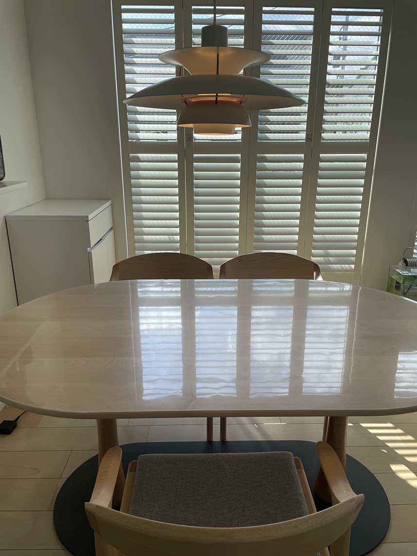 南側のかなり日当たりの良い場所に置いているテーブルなので逆光に座ると反射で眩しいのですがランチョンマットなどを敷けばさほど気になりません。