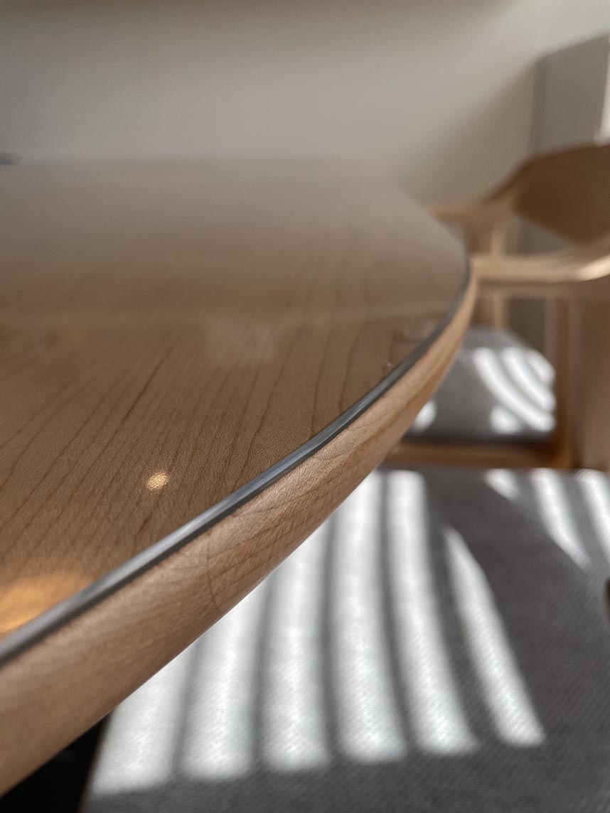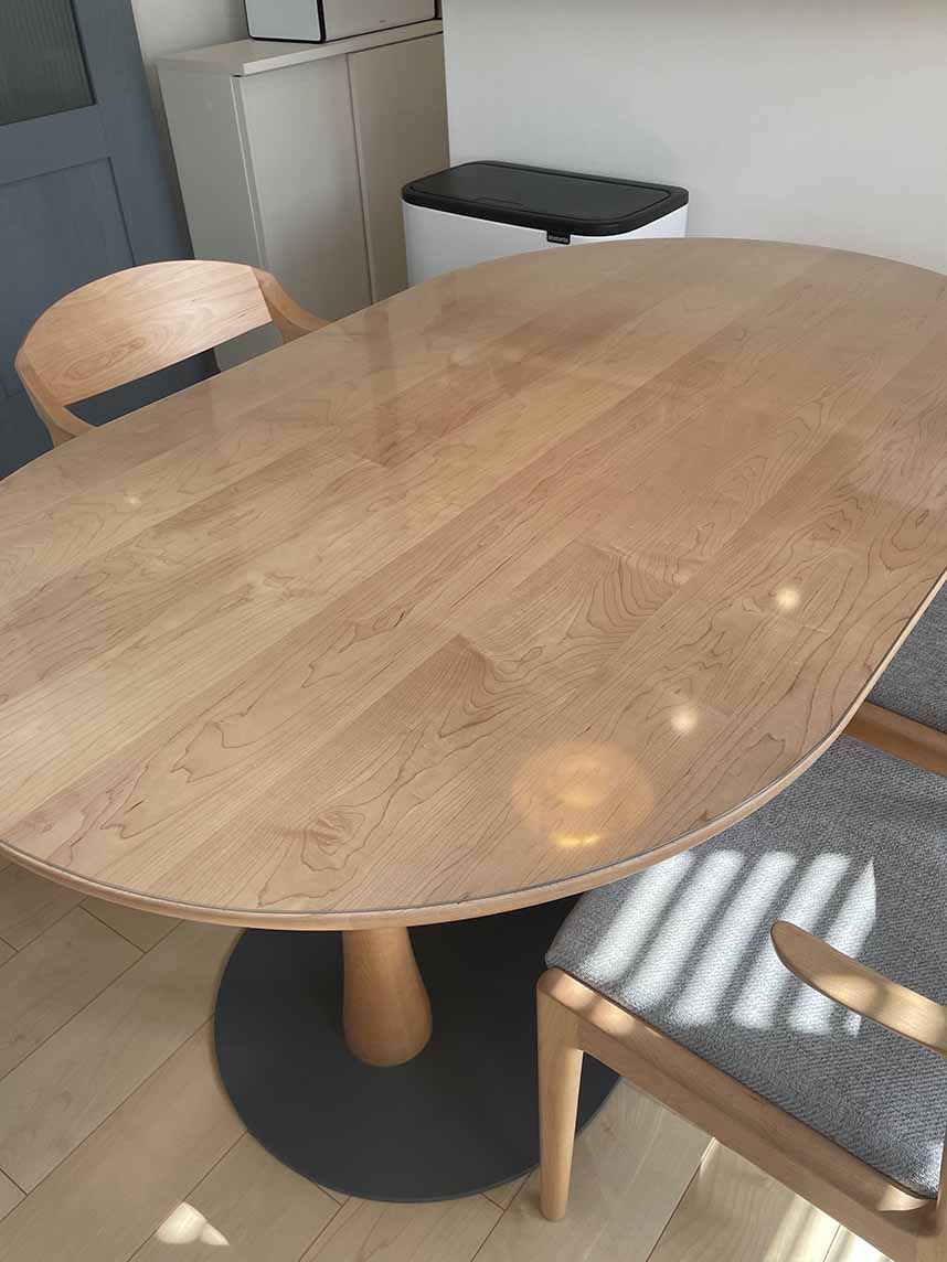 新しい無垢のテーブルなので天板に傷やシミなど付けない様かなり注意しながら使用していましたが、マットを敷いてからはそれも無くなって大変快適になりました。