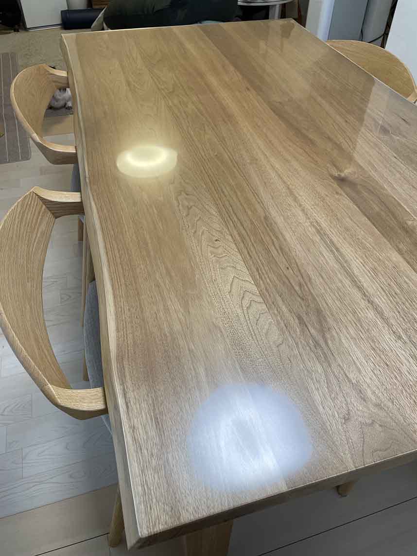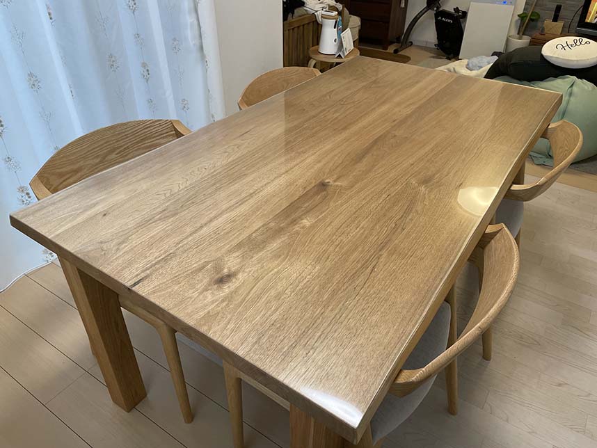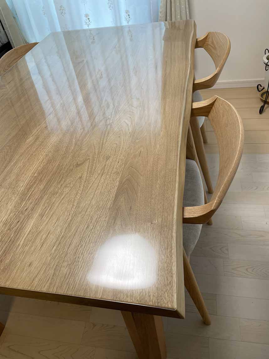 耳付きの胡桃材無垢のテーブルに合うテーブルマットを探していましたが、変形サイズオーダーが可能であるこちらに注文させてもらいました。初めてのオーダーなので試しに2mmにしましたがガラスを敷いたかのような透明度、質感ともに素晴らしいです。なんと言ってもサイズがピッタリで感動しました。我が家の場合滑り止めを使わずとも大丈夫そう。オーダー時の採寸紙も返してもらえたので、劣化したらまた注文します。かなりオススメです。
