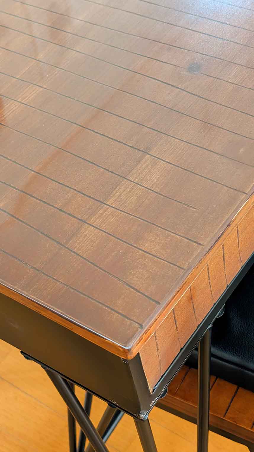 テーブルとマットの間に気泡も入らず透明感もあるので、お気に入りの木目やビンテージ風のデザインを損なうこと無く、高級感も出てとても良い感じになりました